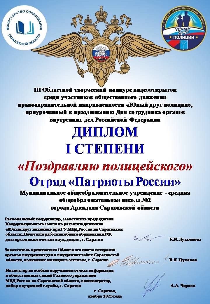 Этот конкурс даёт возможность не только показать уважение ребят к профессии работников полиции, узнать о ней и о людях, которые стоят на страже порядка, но и на деле креативно и творчески поздравить сотрудников органов внутренних дел с их профессиональным праздником.Видеооткрытка юных друзей полиции из школы № 2 города Аркадака завоевала диплом I степени. Они приняли участие в 3-ем областном конкурсе «Поздравь полицейского».