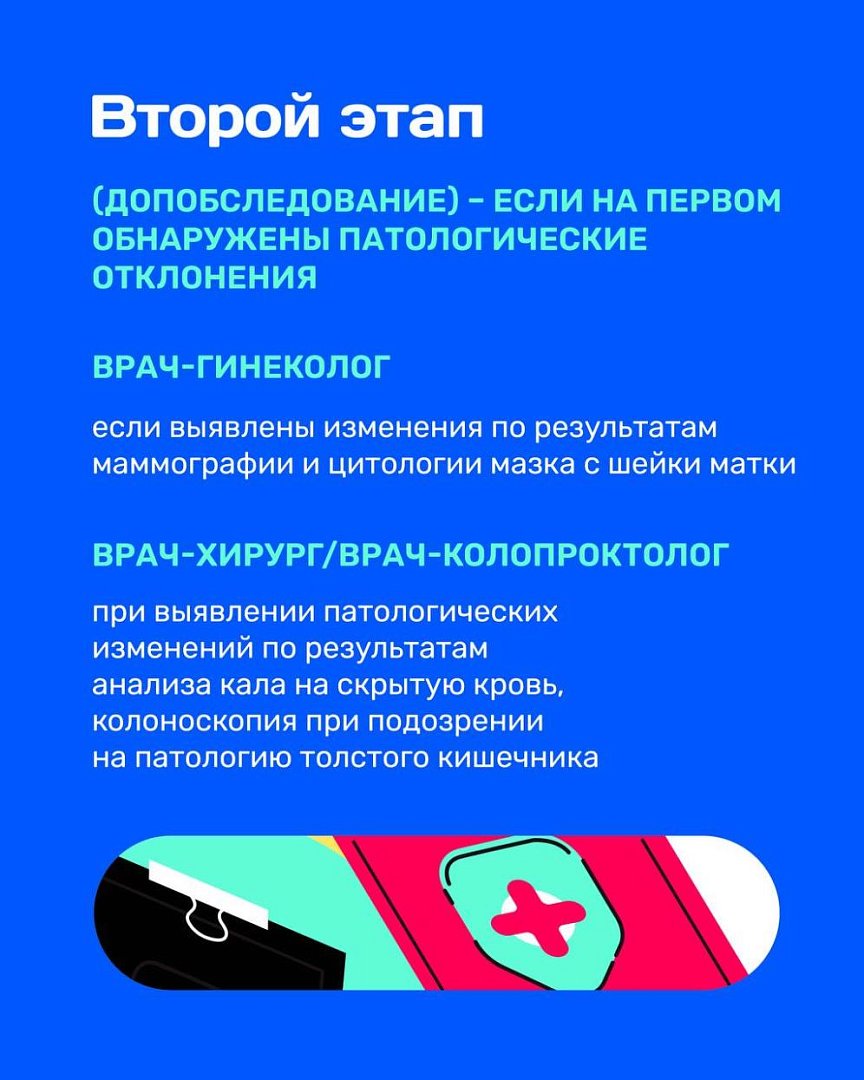 Некоторые патологии могут коснуться любого человека, даже ведущего здоровый образ жизни. И одна из таких патологий — онкологические заболевания. Для того чтобы выявить онкологию, когда еще нет симптомов, необходимо пройти диспансеризацию. Онкозаболевания, обнаруженные на ранней стадии, излечимы в 90% случаев.Диспансеризация проводится в два этапа. Подробнее — в карточках