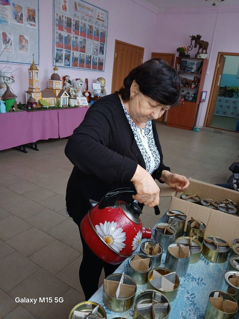 На этот раз они залили очередную партию окопных свечей (130 штук), изготовили 95 штук парафиновых розжигов для костра "Костер в кармане" и упаковку травяного чайного сбора. Работа здесь ведётся слаженно: заливают, сушат, закупают, упаковывают, кто-то баночки приносит. Кистендейские женщины объединяются и работают для фронта. Во время общего дела они поют.