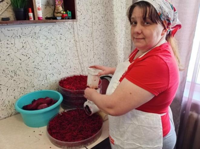Елена Лобачева и Вера Семина продолжают обрабатывать овощи и готовить овощные заправки, супы и борщи. Сушат морковь, лук, свёклу, капусту, зелень, картофель, добавляют различную крупу, специи, чтобы было всё по- домашнему вкусно