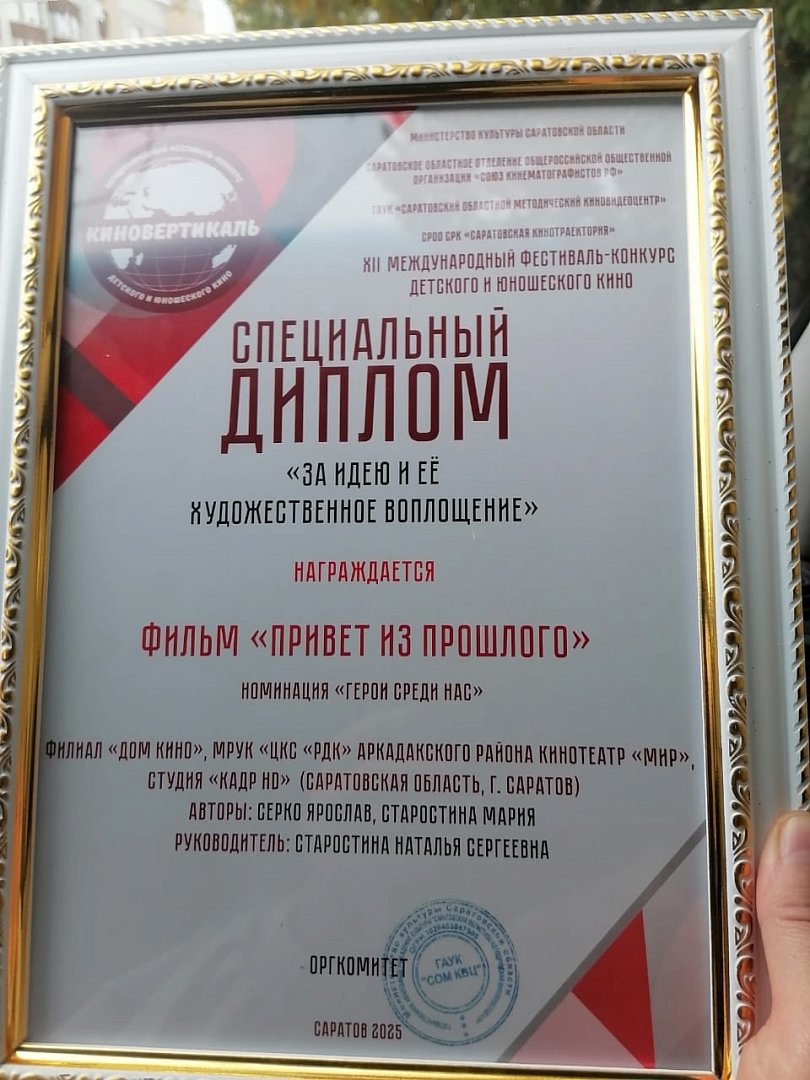В прошлом году студия была одним из первых обладателей специального приза имени Сергея Пускепалиса. Напомним, что работу наших ребят выбрал для поощрения сын киноактёра - Глеб Пускепалис.Мы уже сообщали о том, что при кинотеатре «Мир» города Аркадака действует молодёжная студия «Кадр», где дети учатся снимать видеоролики с претензией на полноценное короткометражное кино. Руководит студией Наталья Старостина. Уже не первый раз работы молодёжной студии принимают участие в Международном конкурсе «Киновертикаль», который проводится в Саратове. И всякий раз они бывают удостоены каких-либо наград.