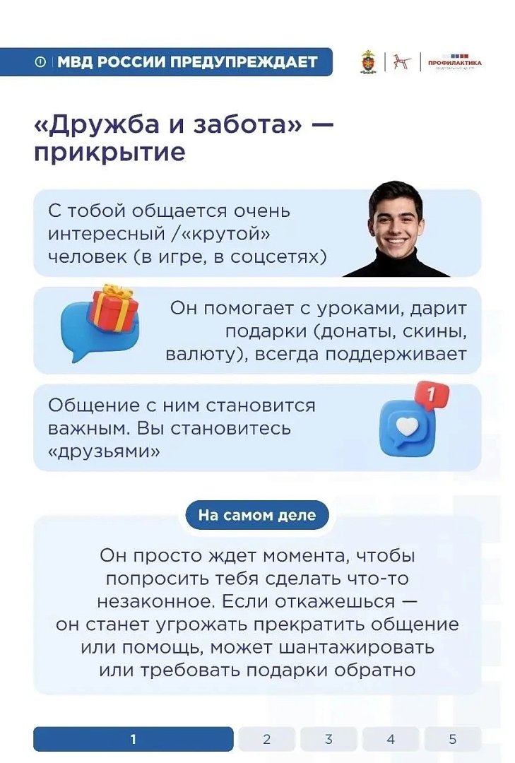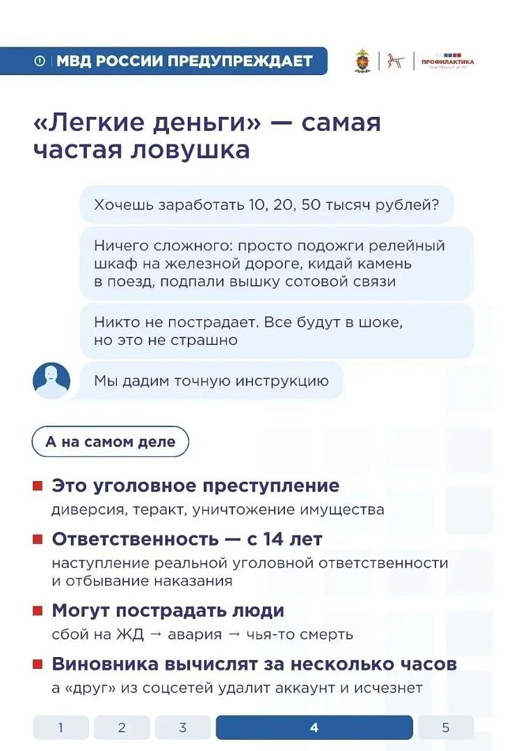 Чтобы помочь детям, родителям и педагогам распознать опасность, МВД России совместно с Федеральным центром «Профилактика» и Институтом Воспитания при участии транспортной полиции подготовили серию графических карточек. В них наглядно разобраны самые распространённые схемы вовлечения несовершеннолетних в преступления.